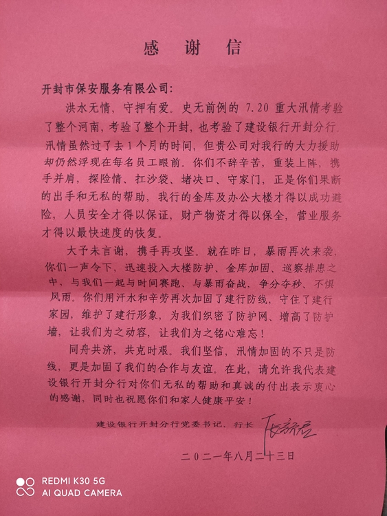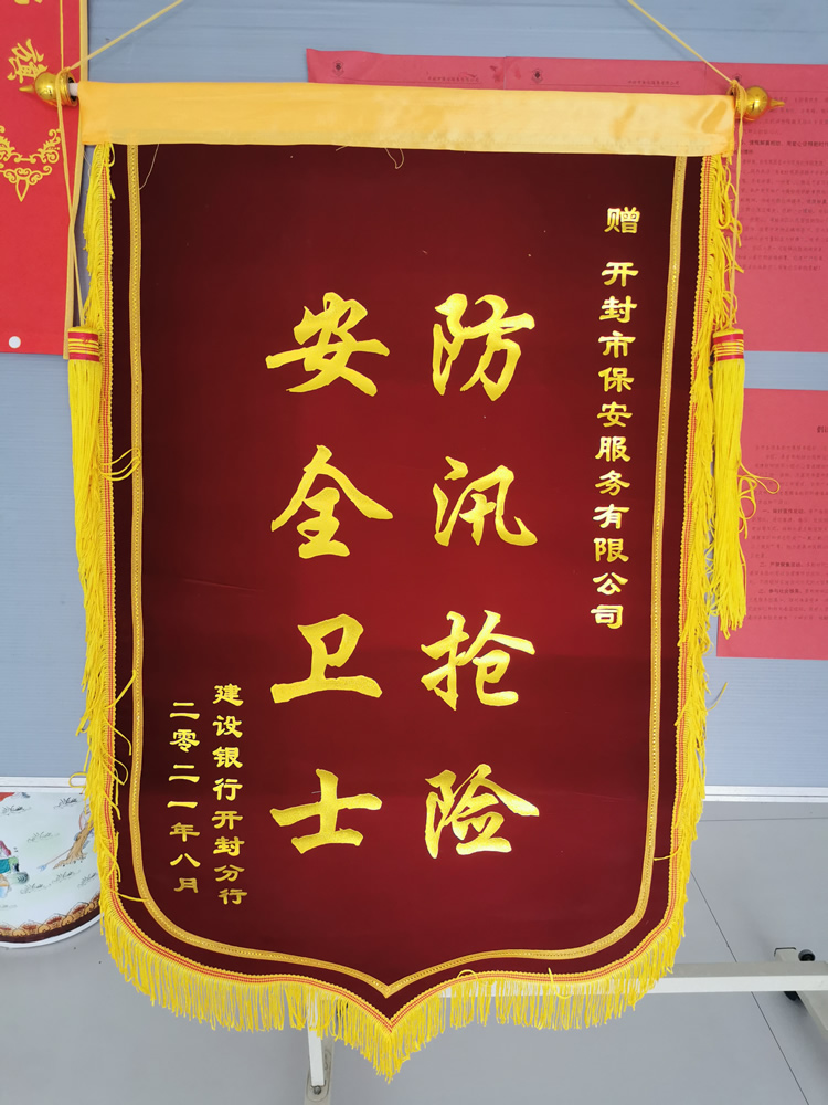 8月24日,中國建設(shè)銀行開封分行李行長等一行4人,向公司贈(zèng)送寫有“防汛搶險(xiǎn)安全衛(wèi)士”的錦旗,以感謝公司派駐該銀行的保安隊(duì)員在近期重大汛情考驗(yàn)中防汛搶險(xiǎn)的突出表現(xiàn)。