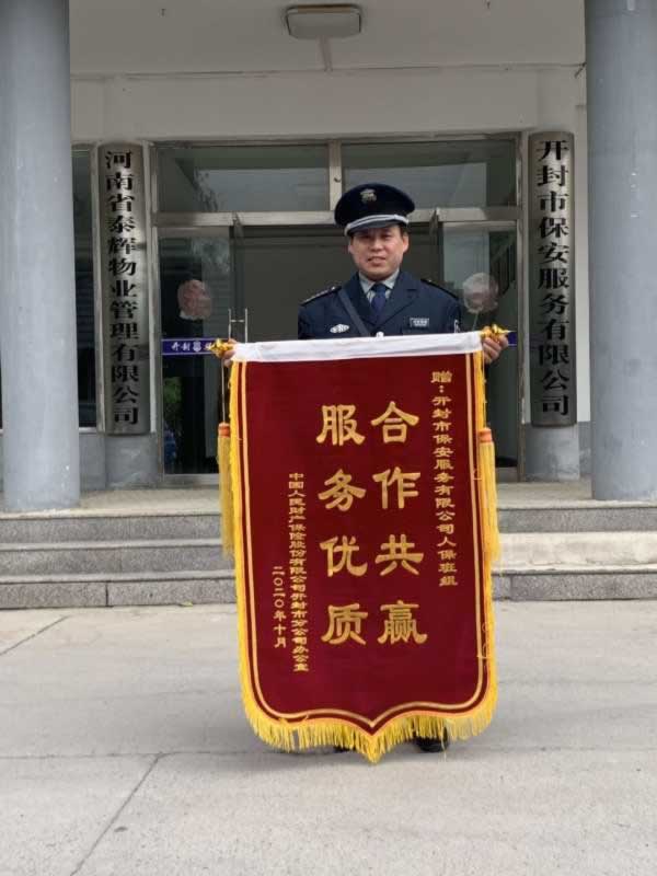 2020年10月26日上午,人保財(cái)險(xiǎn)公司辦公室一行3人為開封市保安服務(wù)有限公司送來一面上書“合作共贏,**服務(wù)”的錦旗,對公司保安一部駐人保財(cái)險(xiǎn)班組的工作給予了充分的肯定,對班組隊(duì)員積極認(rèn)真的工作作風(fēng),熱情周到的服務(wù)提出了表揚(yáng)。